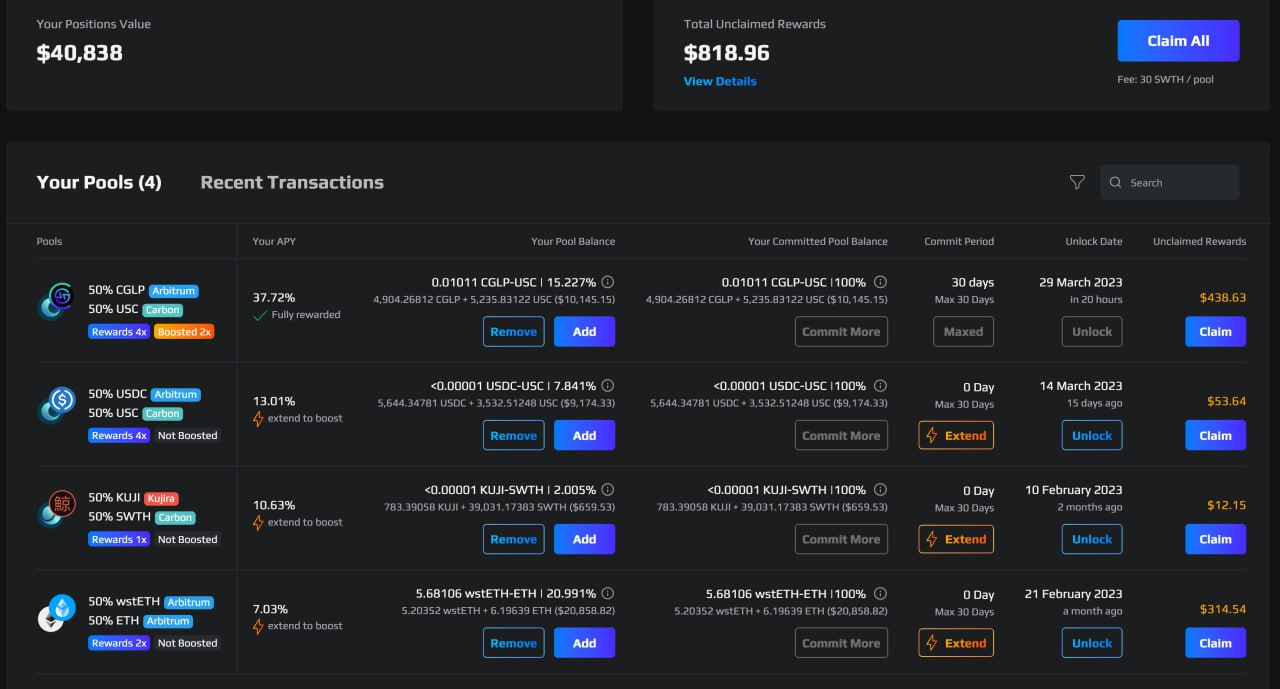 **Step 3:** The page displays all the pools you have added and committed liquidity to.