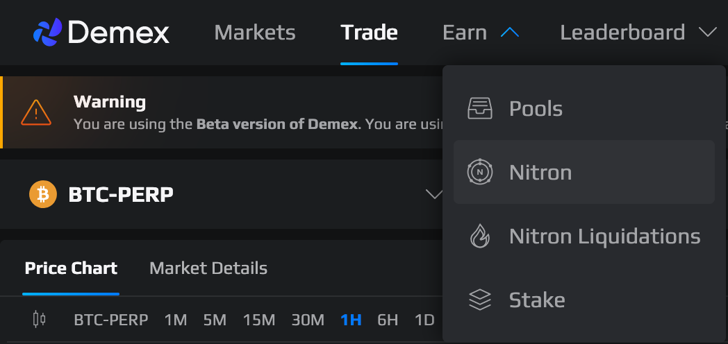 **Step 1:** Launch Demex, click “Earn” in the navigation menu and click “Nitron” under the dropdown bar.