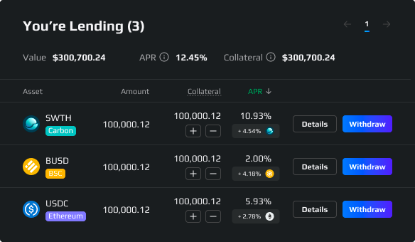 **Step 2:** Under the “You’re Lending” window, you can view all assets that you can have lent out at any given time. You can also view how much you have locked in as your collateral out of your total lent amount.