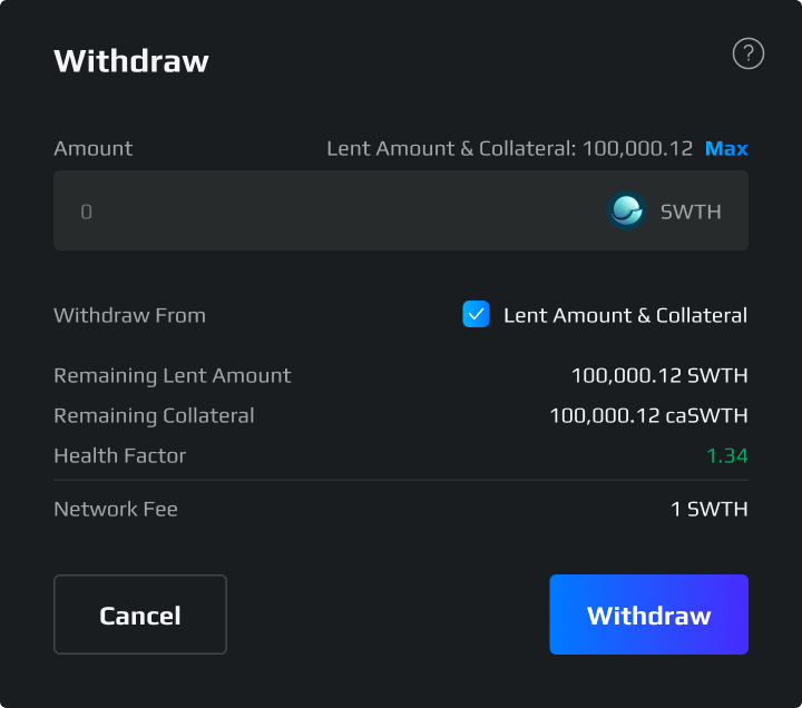 **Step 4:** Enter the desired amount you wish to withdraw. You can choose to withdraw just the lent out amount or the lent amount along with collateral.
