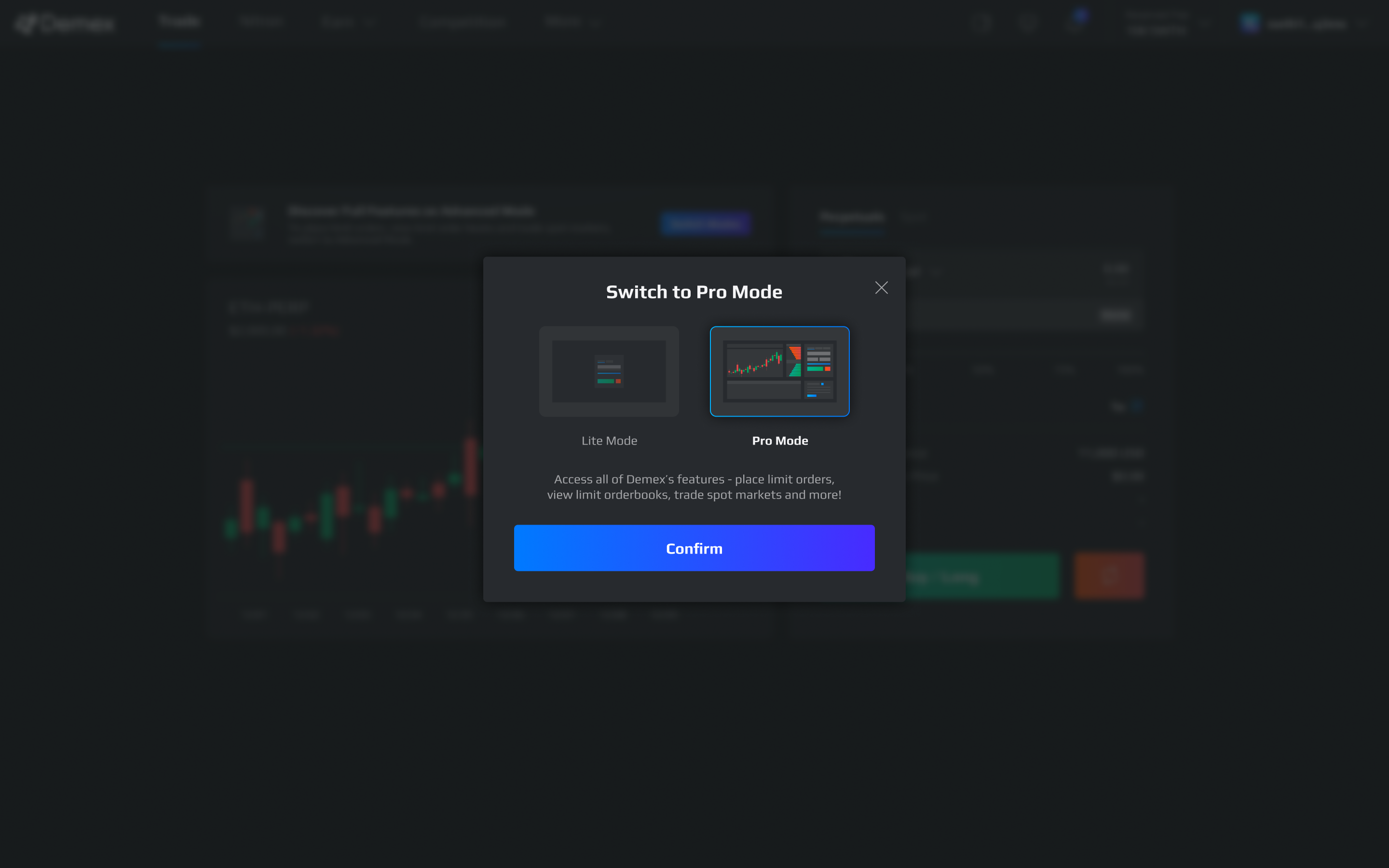 For the user guide on how to trade under Pro Mode, click [here](https://guide.dem.exchange/~/changes/REiUq5w3vfdfOKEL0jdy/trade/futures/trading-mode/trading-futures-on-demex).