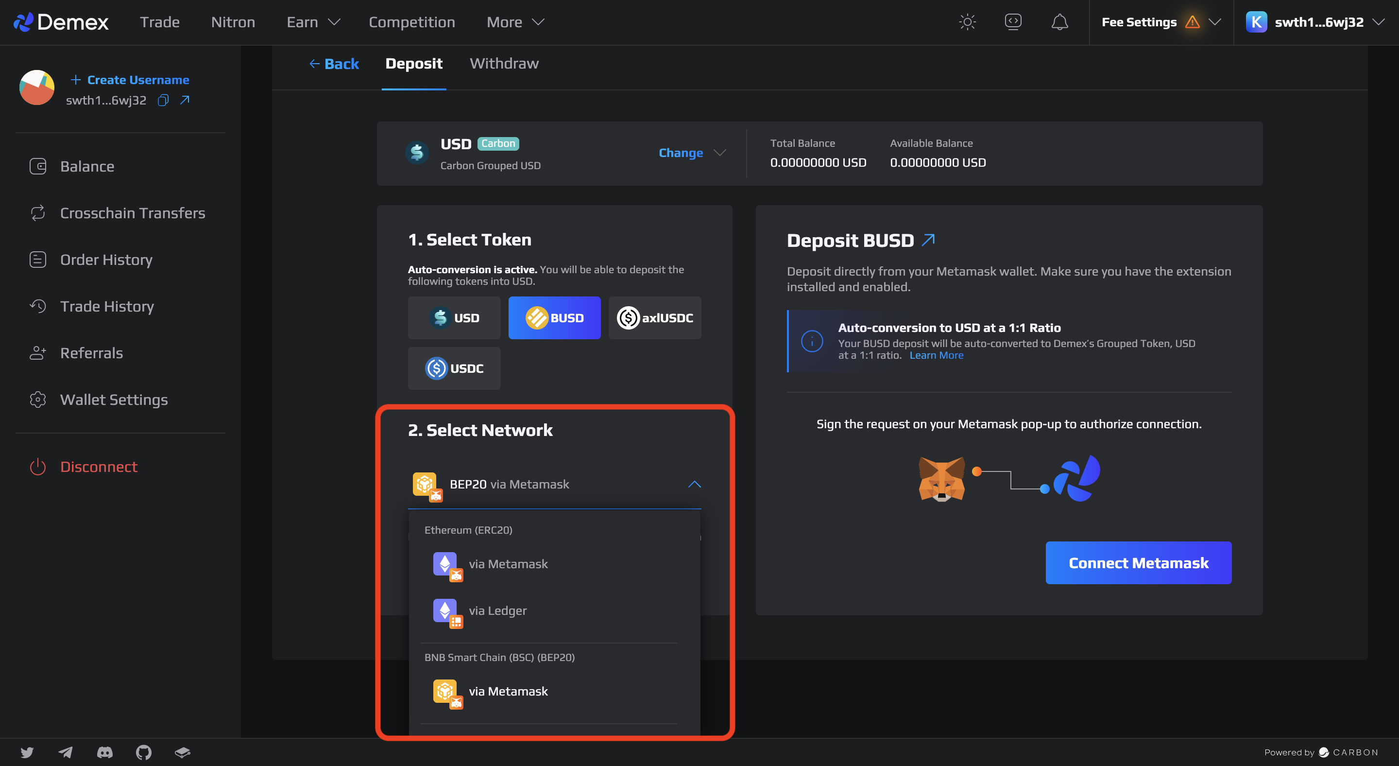 **Step 7:** To track the status of your transaction after depositing your tokens, click on your wallet address in the top left corner and go to the 'Transactions' section on [Carbonscan](https://scan.carbon.network/). If the deposit is successful, the deposit status will be shown as 'Success'.