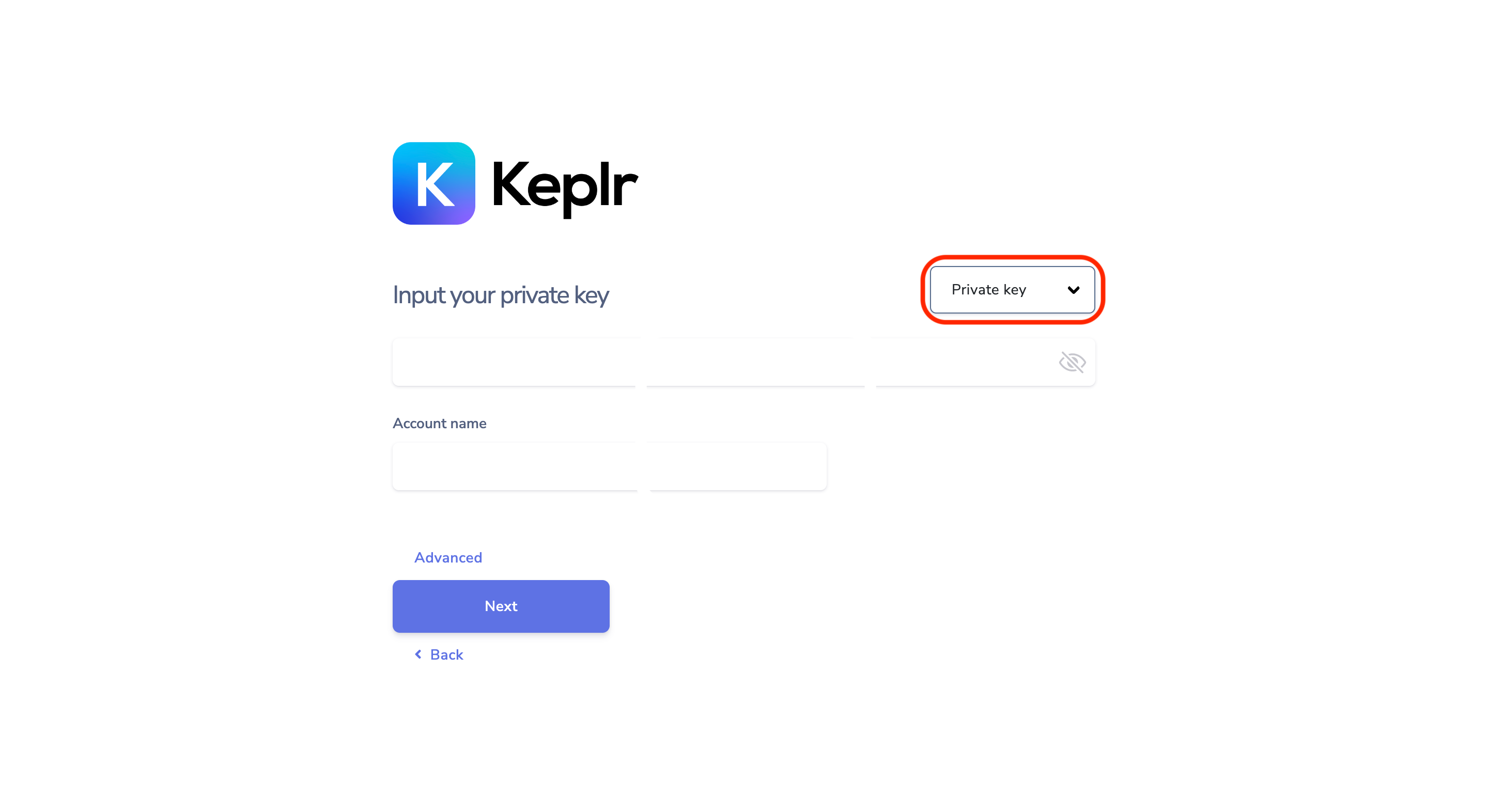 **Step 8**: Select 'Private Key' from the drop-down menu. Then, paste the private key that you copied in Step 4 into the space provided.