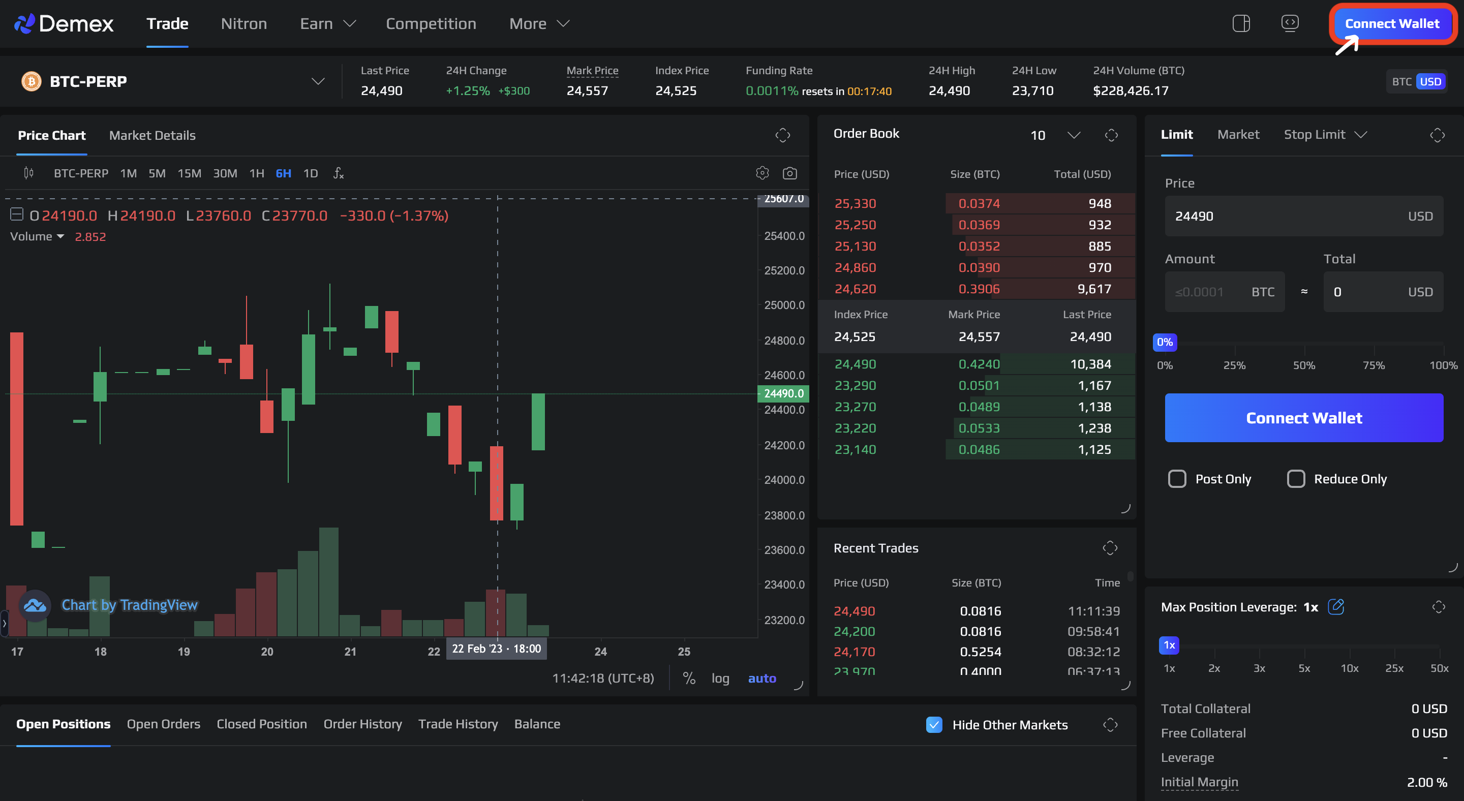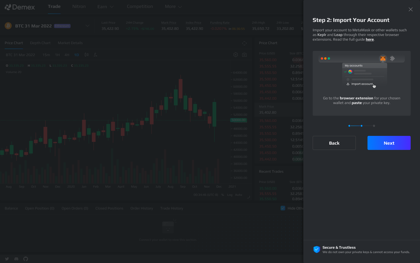 **Step 1**: Navigate to the [Demex website](https://app.dem.exchange/) and click on the 'Connect Wallet' button located at the far-right corner.