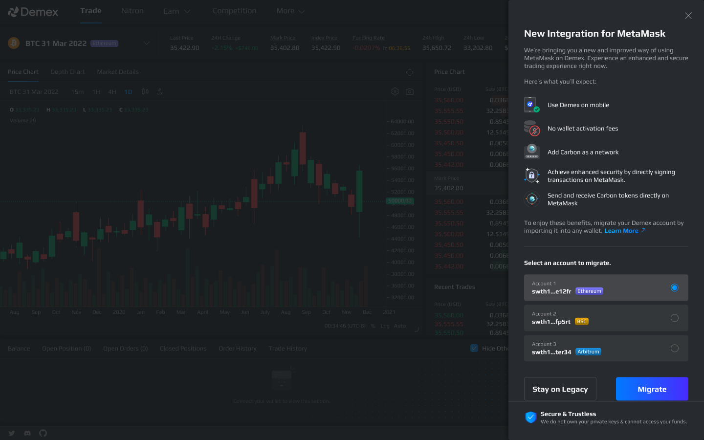 Following a successful migration, you can now [connect to Demex using MetaMask](https://guide.dem.exchange/~/changes/REiUq5w3vfdfOKEL0jdy/welcome/getting-started/wallet-connection/metamask/user-guide/connection). The enhanced integration allows you to link your native balance between Carbon Core and Carbon EVM, enabling seamless navigation between the IBC and Ethereum ecosystems.