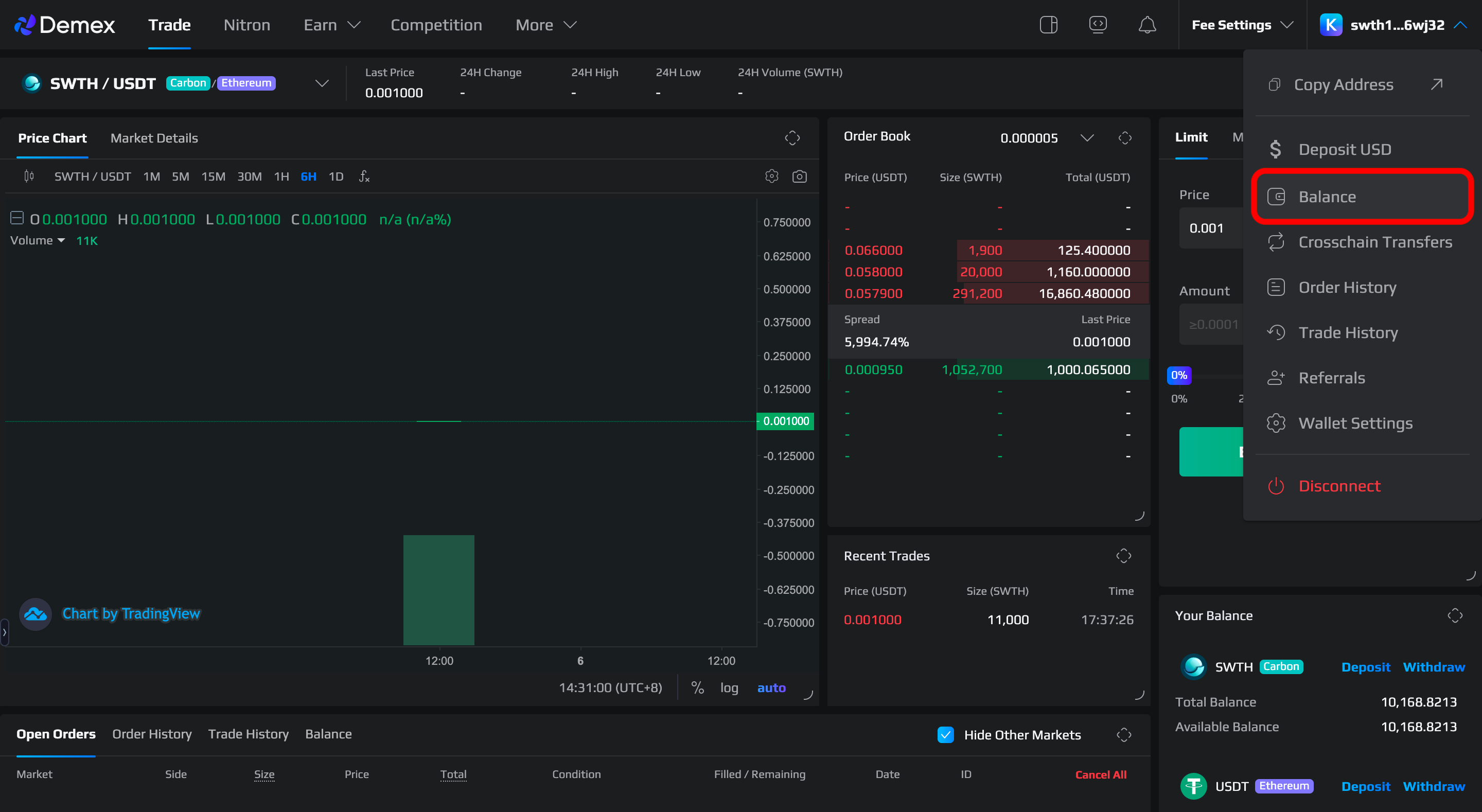 **Step 1**: Navigate to the [Demex website](https://app.dem.exchange/) and select '[Balance](https://app.dem.exchange/account/balance)' from the menu located on the right-hand side.